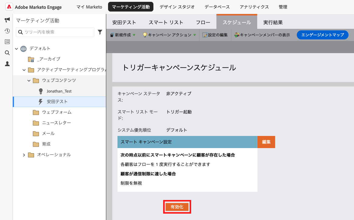 スケジュール画面より、トリガーキャンペーンスケジュールを「有効化」する