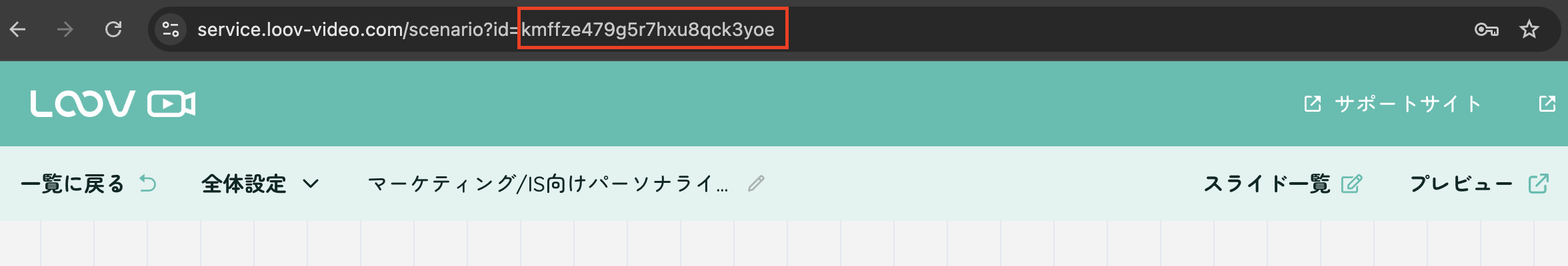 https://service.loov-video.com/scenario?id= [xxx] の[xxx] 箇所がシナリオIDです。