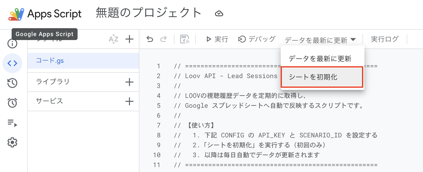実行ボタンの隣にあるドロップダウンから [シートを初期化] を選択します。