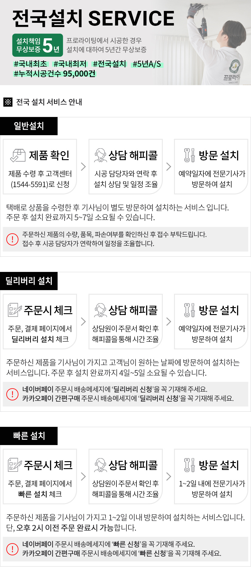 ํ๋ก๋ผ์ดํ ์ค์น ์๋น์ค๋ ์ผ๋ฐ์ค์น, ๋๋ฆฌ๋ฒ๋ฆฌ ์ค์น, ๋น ๋ฅธ ์ค์น 3๊ฐ์ง ์๋น์ค๊ฐ ์์ต๋๋ค.