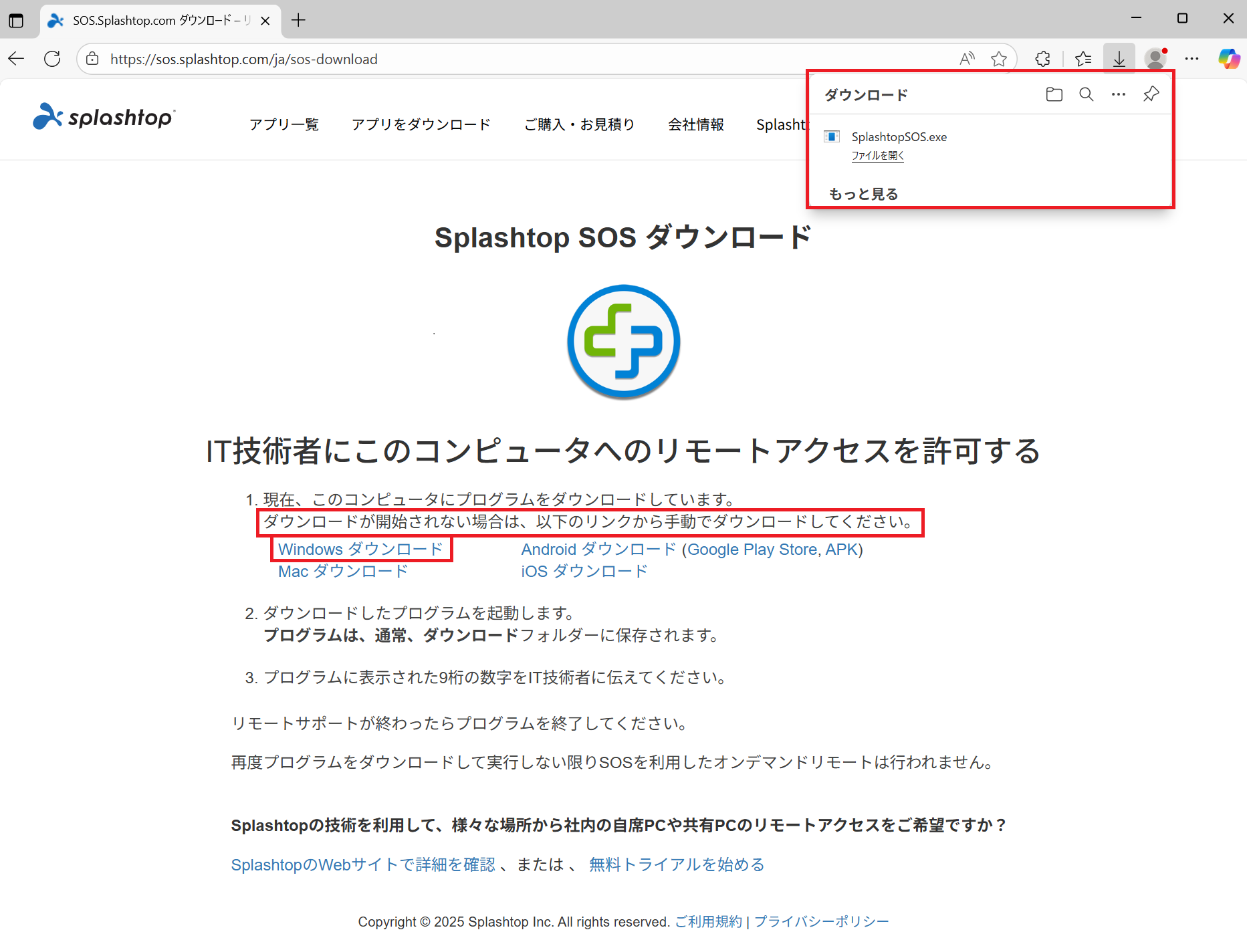 検索後、自動的に「SplashtopSOS.exe」のダウンロードが開始されます。