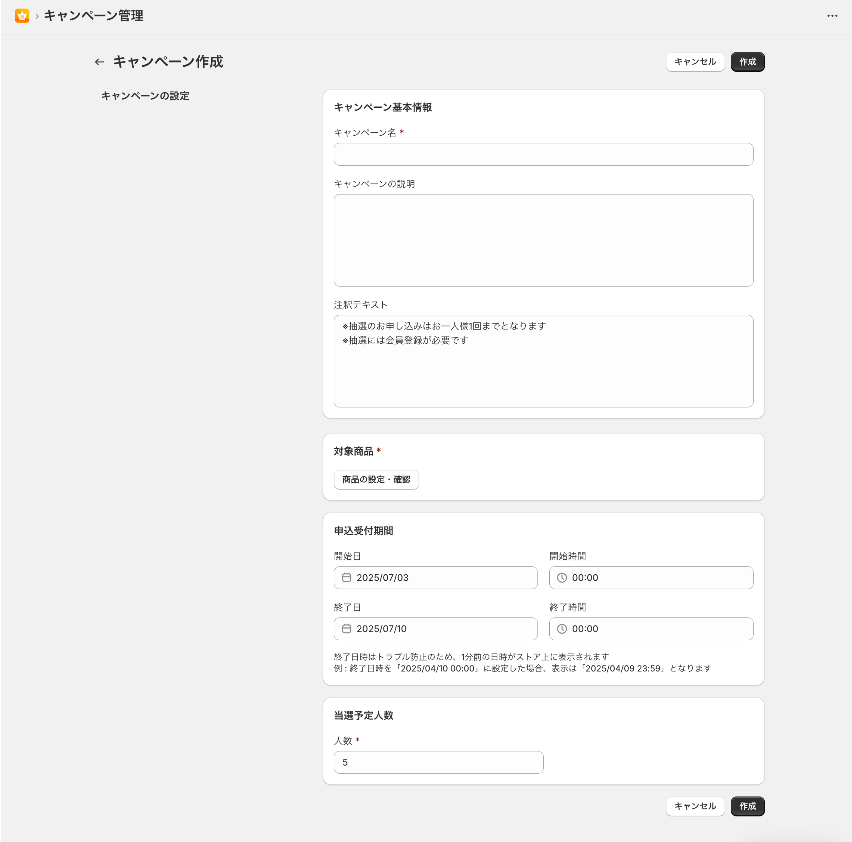 キャンペーン作成ページより、以下の項目を入力