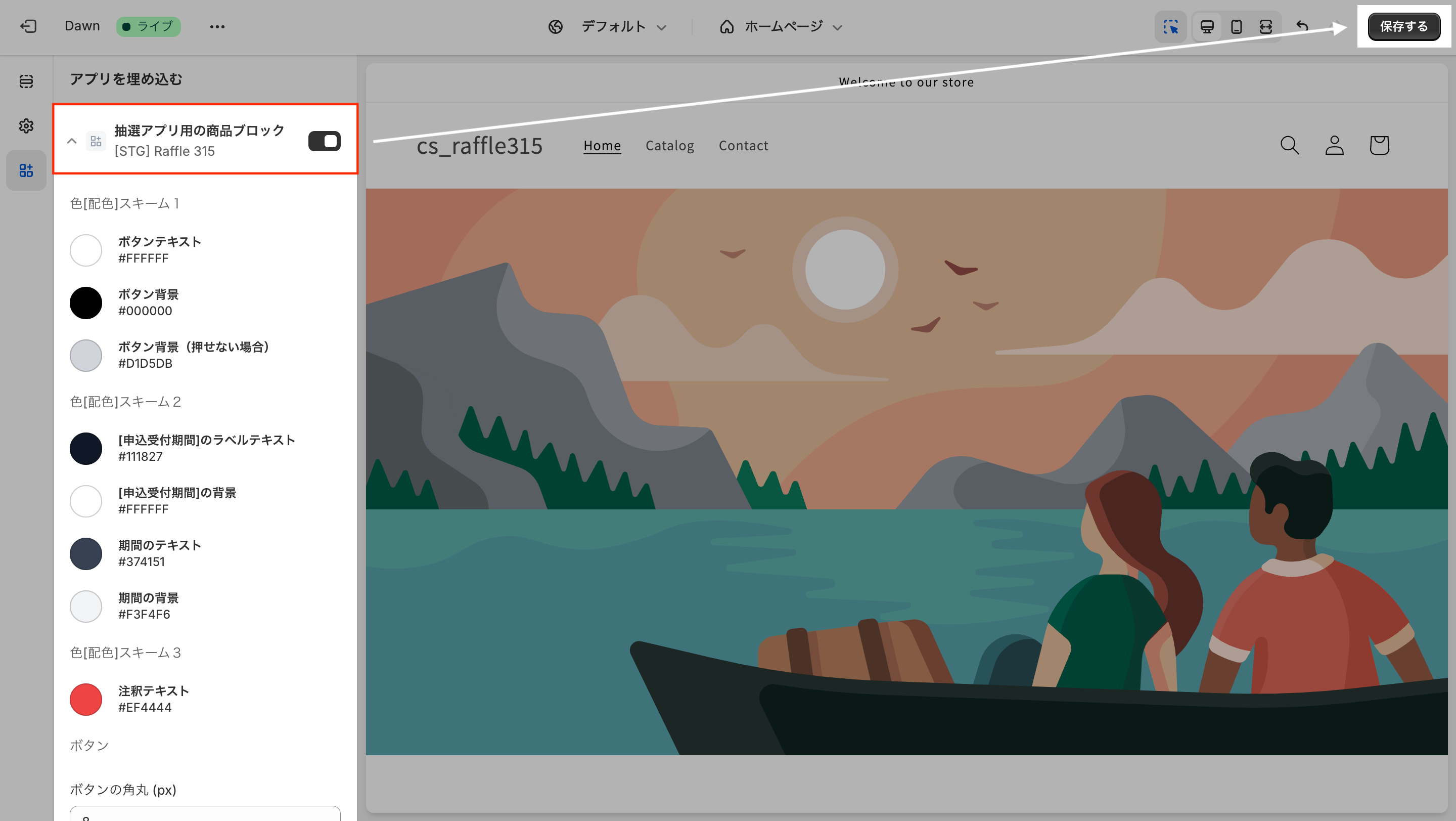 <div id="raffle315-container"></div>ブロックを任意の位置に移動して「保存」をクリック
