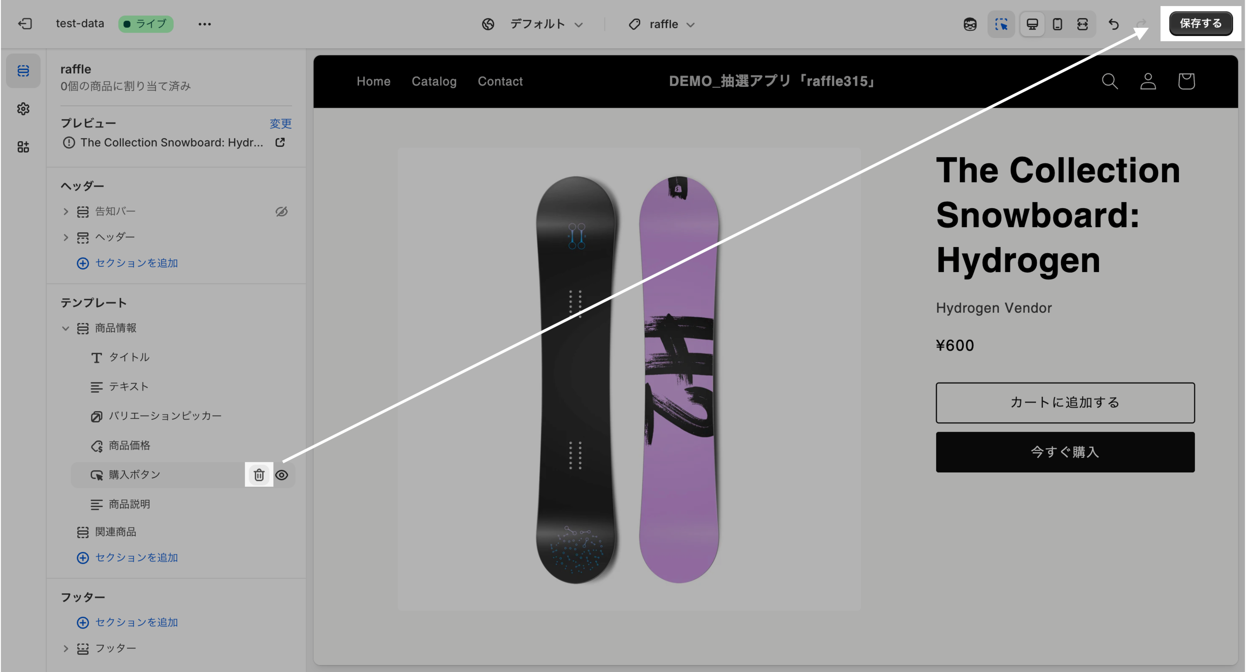 作成したテンプレートから、購入ボタンを削除し、「保存」をクリック