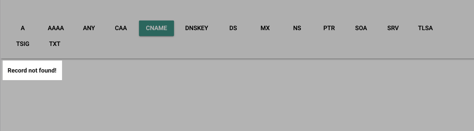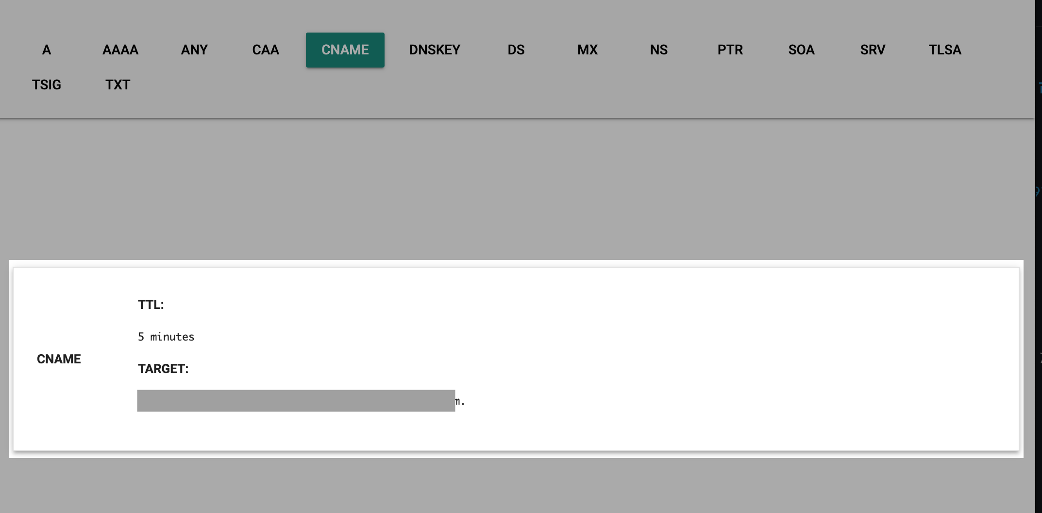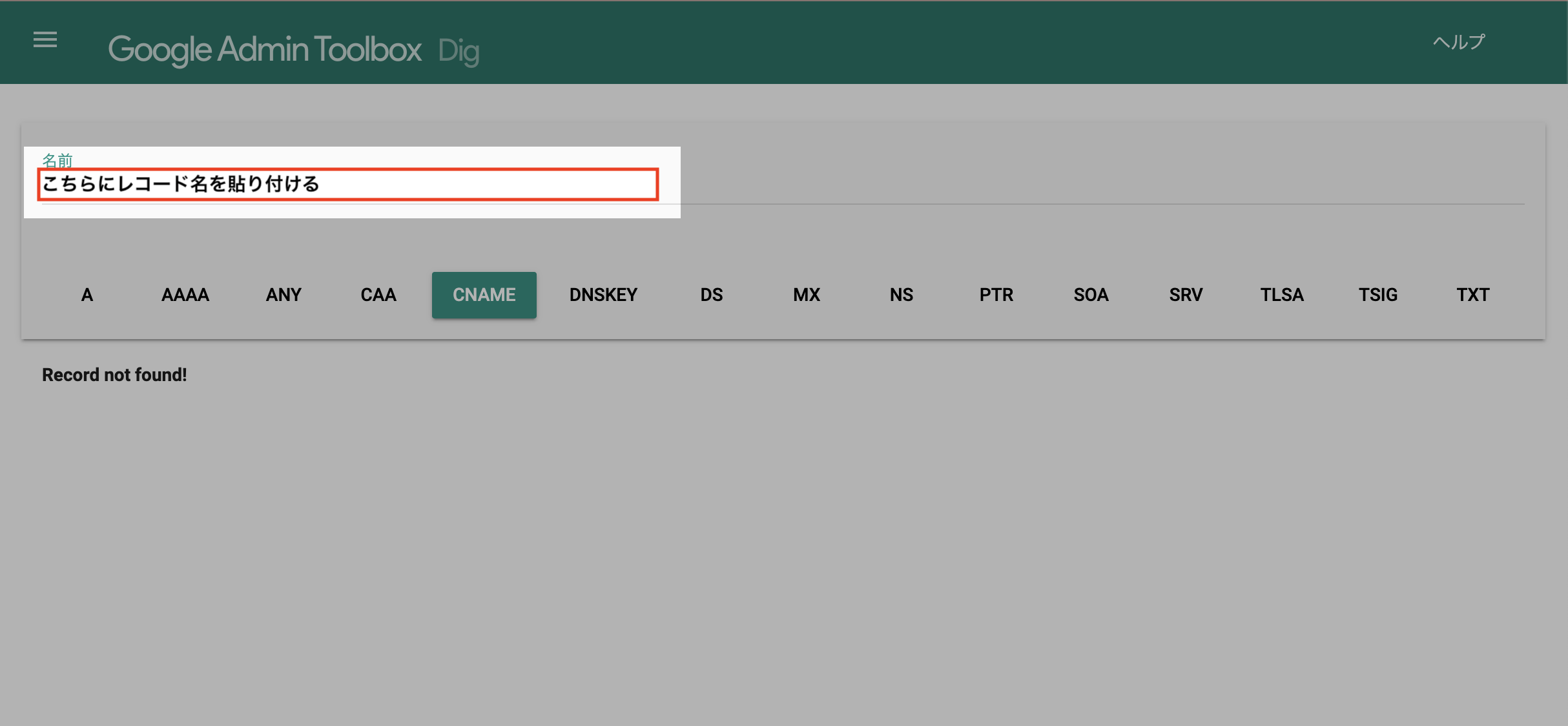 Digツールにレコードを貼り付け、CNAMEの場合は「CNAME」ボタン、TXTの場合は「TXT」ボタンをクリックして、DNS設定が正しく反映されているかご確認ください。