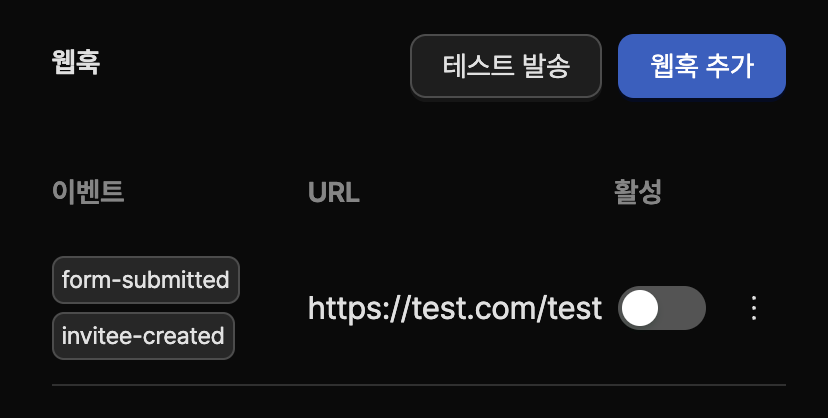 따라서 활성 토글 버튼을 클릭하여 웹훅 이벤트를 활성화 해야합니다.