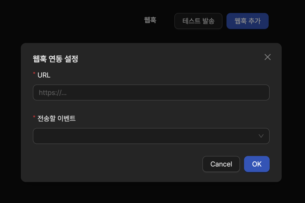 테스트 발송 버튼을 클릭하여 입력 필드를 채운 후 전송 버튼을 클릭하면 테스트용 웹훅 이벤트 정보를 받을 수 있습니다.
