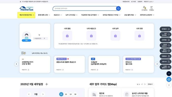 계산서·영수증·카드 메뉴를 클릭해 주세요