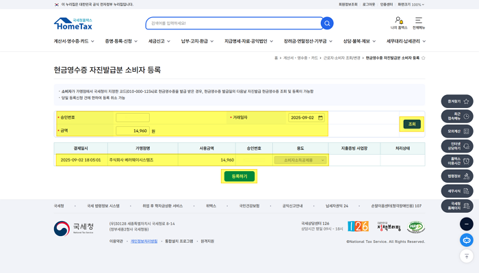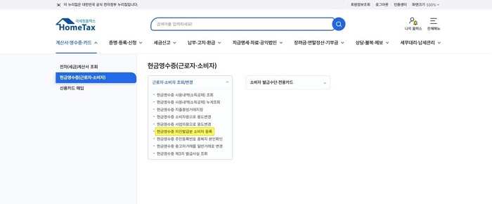 현금영수증(근로자·소비자) > 현금영수증 자진발급분 소비자 등록 메뉴를 클릭해 주세요