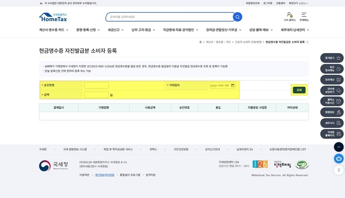 승인번호, 거래일자, 금액을 입력하고 '조회'를 클릭해 주세요.