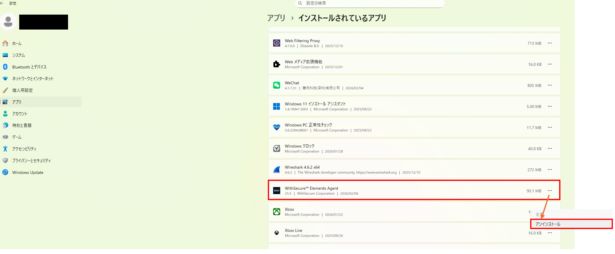 2.「WithSecure™Elements Agent」の「・・・」を押してアンインストールを選択します。