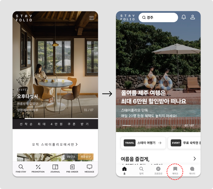 스테이폴리오에 와서 처음으로 한 일이 서비스 UI 개선이다. 우리가 좋은 여행 경험을 제공한다고 말하고 있는데, 정말 여행 경험이 좋은 걸까 의문이 있었다. 그전에 만들어 보았던 서비스들을 보다가 스테이폴리오를 보니까 상대적으로 불편해 보였다. 모바일에 최적화된 UI라기보다는 ‘PC 매거진’에 가까웠다. 원래 그렇게 시작한 서비스이기도 하다. ‘모바일 뷰가 있는 PC 매거진’을 ‘모바일 쇼핑몰’로 바꾸는 작업부터 시작했다. 그게 저에게는 브랜딩이었다.