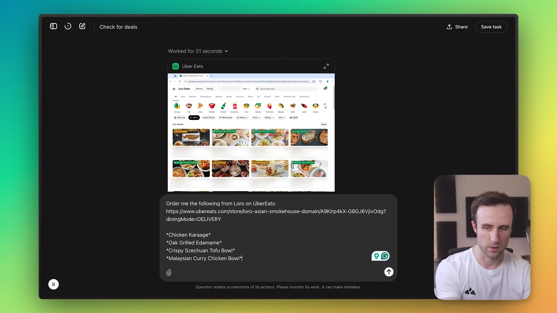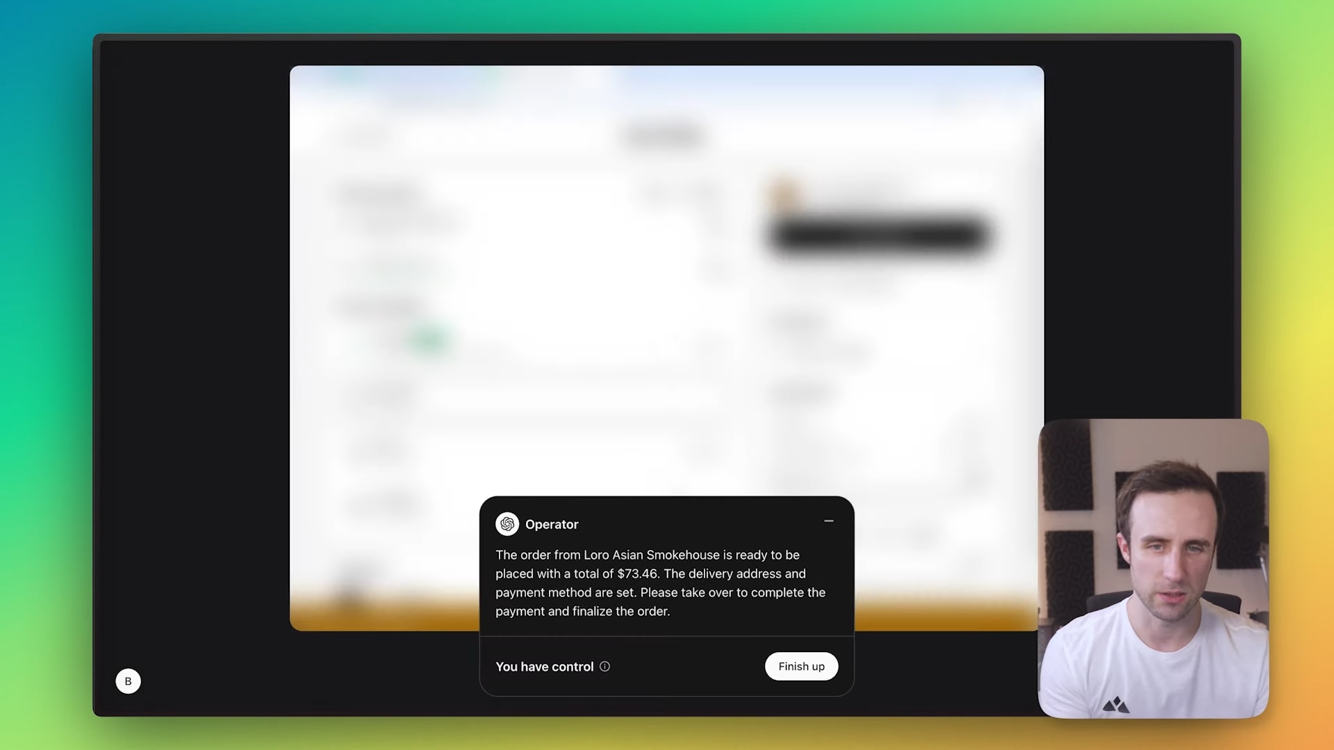 역시 리뷰 영상을 통해 실제 사용 과정을 살펴보았다. 영상의 제목은 ‘챗GPT 오퍼레이터는 돈값을 할까?(Is ChatGPT Operator Worth It?)’. 참고로 오퍼레이터는 월 200달러(한화 약 30만원)의 챗GPT 프로 플랜 구독자만 사용 가능한 비싼 기능이다. 이 영상에서 유튜버는 챗GPT 오퍼레이터에게 저녁 주문을 시킨다. 결제가 완료되기까지의 단계는 다음과 같다.