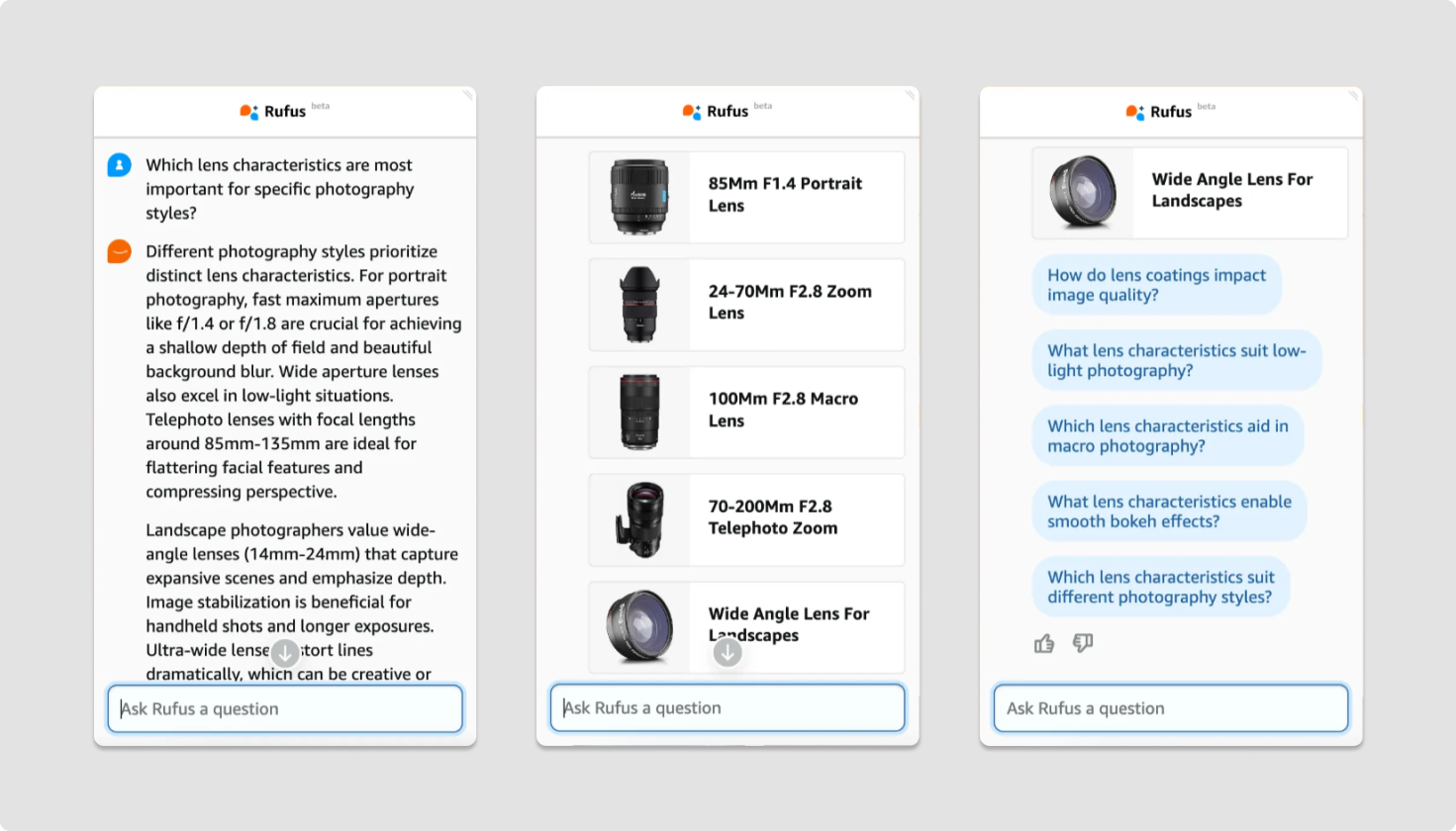 루퍼스의 기본적인 기능은 상품 구매에 도움이 될만한 상세한 정보를 제공하는 것이다. 예를 들어 ‘특정 사진 촬영 스타일마다 중요한 렌즈 특징’을 물어보면 각 스타일에 걸맞는 조리개값이나 초점거리를 알려주고, 각각의 사례에 걸맞는 제품까지 추천한다. 원래는 여러 블로그와 포털 검색창을 전전하며 찾았을 정보들이다. 추가로 이어질 만한 예시 꼬리질문들을 제공하는 것은 기본.