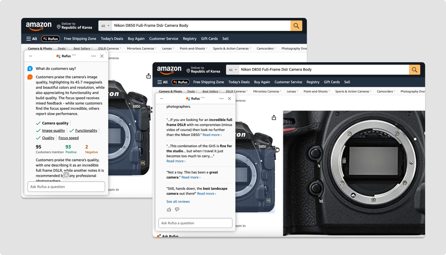 무엇보다 흥미로운 것은 리뷰 요약. 고객들의 제품에 대한 평이 전반적으로 어떠한지 요약해줄 뿐 아니라, 카메라 퀄리티, 이미지 퀄리티 등 항목별로 언급량과 호감도를 수치화해서 제공한다. 루퍼스와의 대화창에서 리뷰들의 프리뷰도 볼 수 있다.