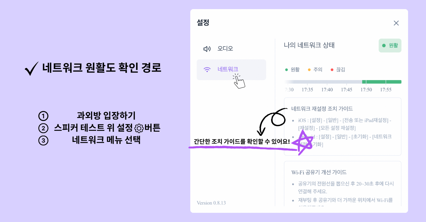 과외방 입장하기→스피커 테스트 위 설정 버튼→네트워크 메뉴 선택