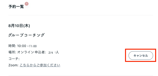 ③キャンセルをご希望のコーチングの【キャンセル】ボタンをクリックする