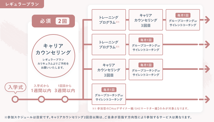 スタンダード・ライトプランの方は受講サポートコーチング参加以降に、そしてレギュラープランの方はキャリアカウンセリング2回目の参加以降に、ご自身の目標や状況に応じて各種コンテンツにご参加いただけます。