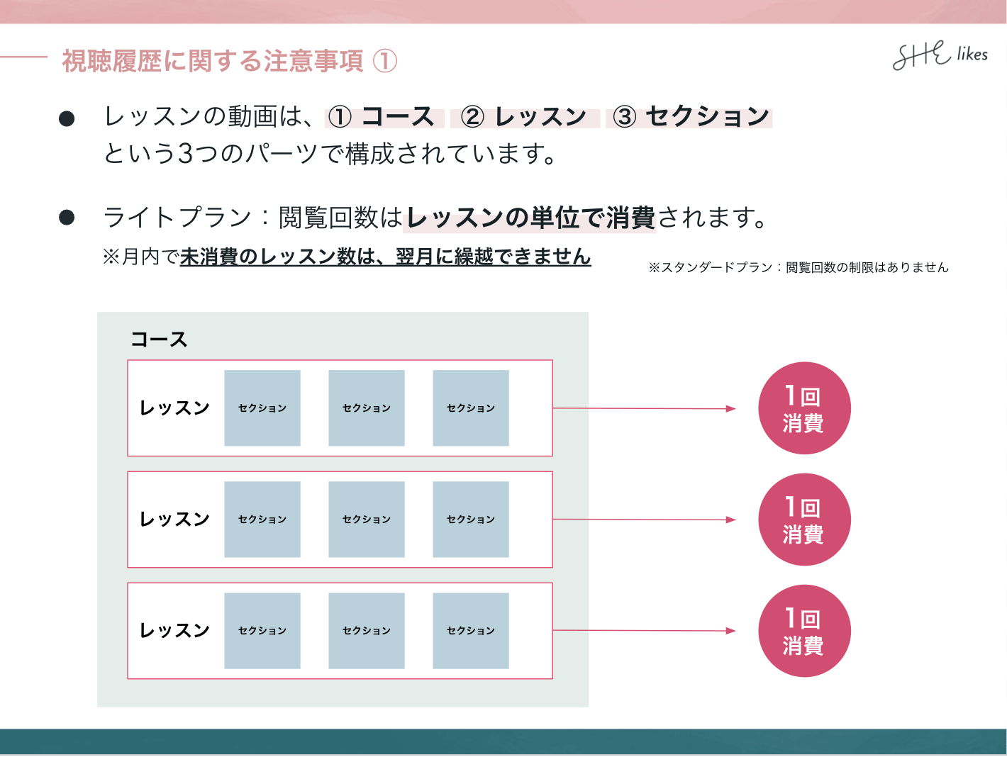 ライトプランの場合、閲覧回数はレッスン(LESSON)の単位で1回ずつ消費されます。