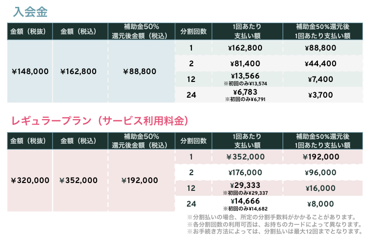 分割払いは、一括、2回払い、12回払いが選択可能です。