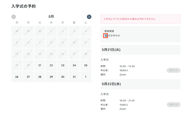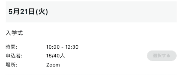 ③ご希望の入学式の「選択する」ボタンをクリックする