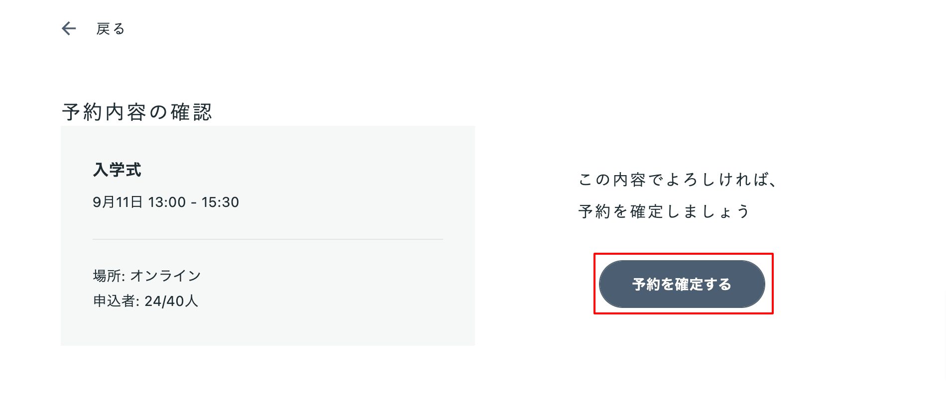 ④予約内容に誤りがないかを確認し「予約を確定する」ボタンをクリックする