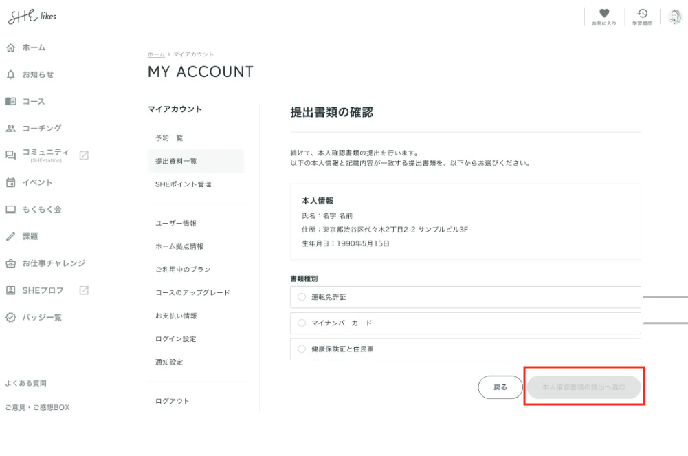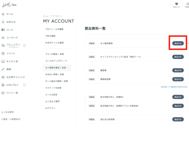 「本人情報の確認/変更」から、提出資料一覧の提出するボタンを押下する