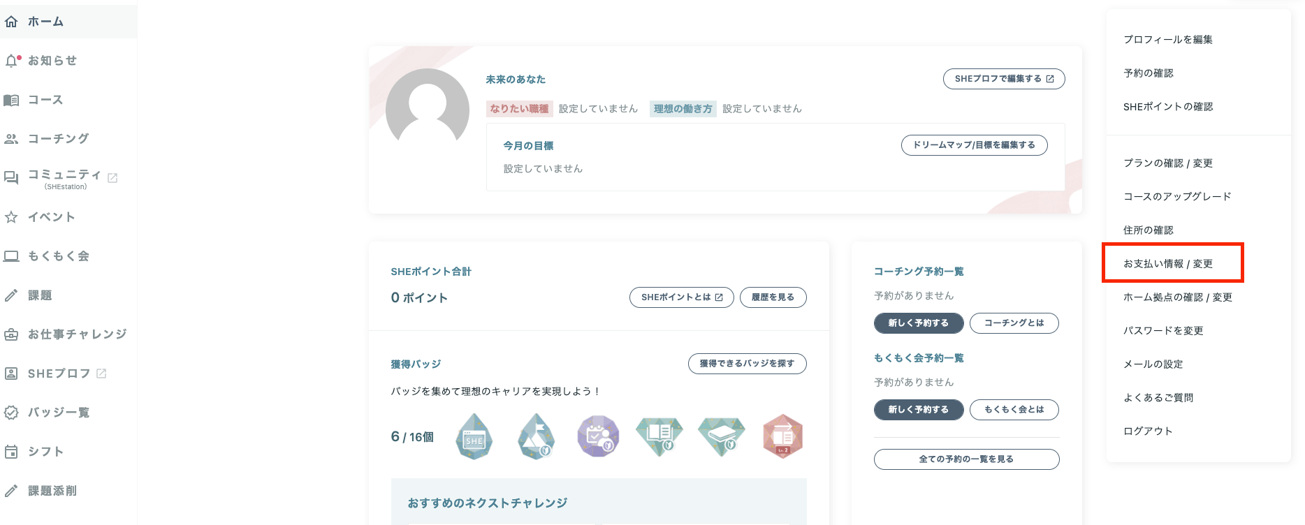 ①マイページログイン後、右上のアイコンを押して「お支払い情報/変更」ページにアクセスしてください