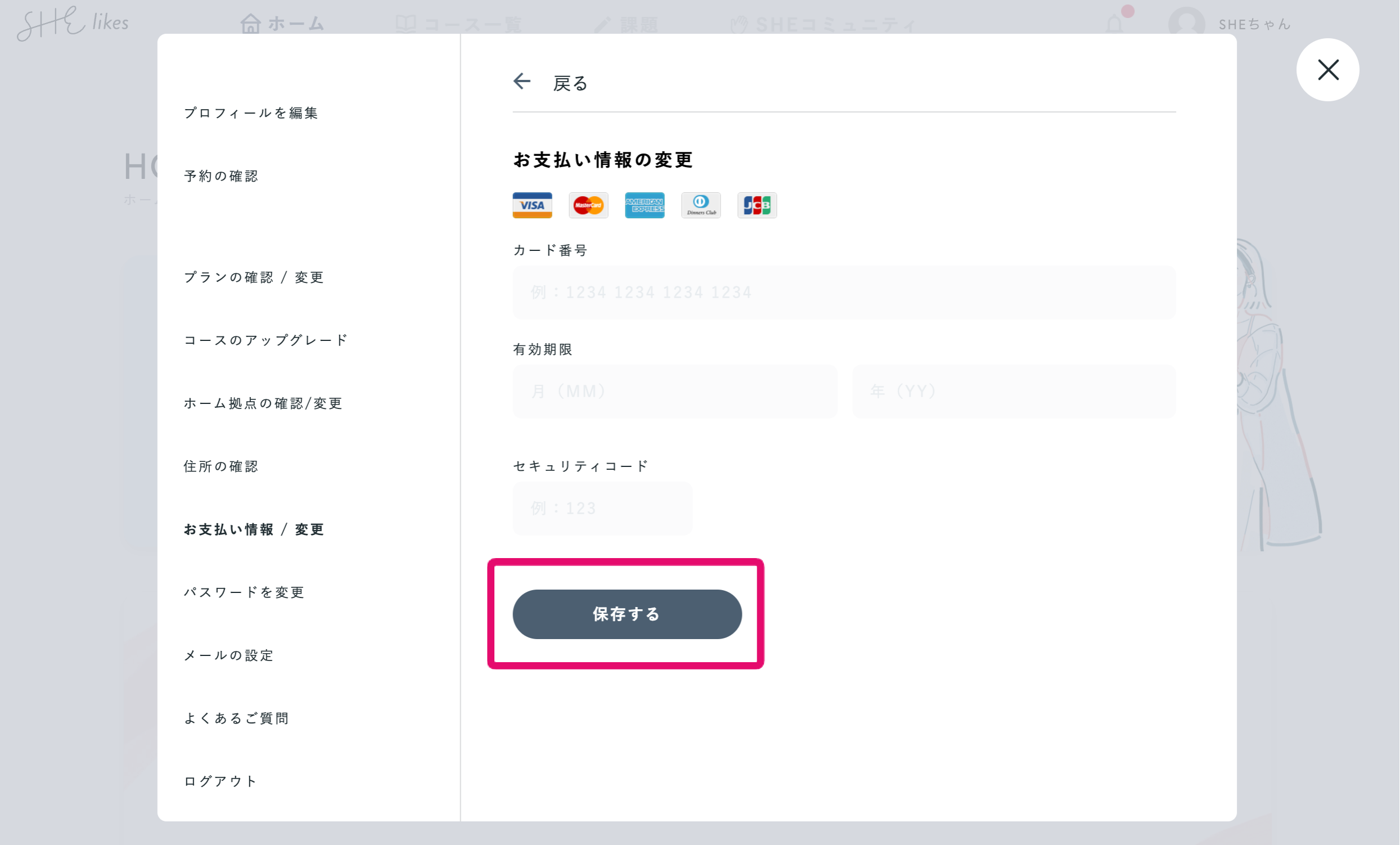 ③新たに設定したいクレジットカード情報を入力し、「保存する」ボタンを押すと変更が完了します