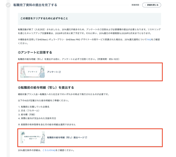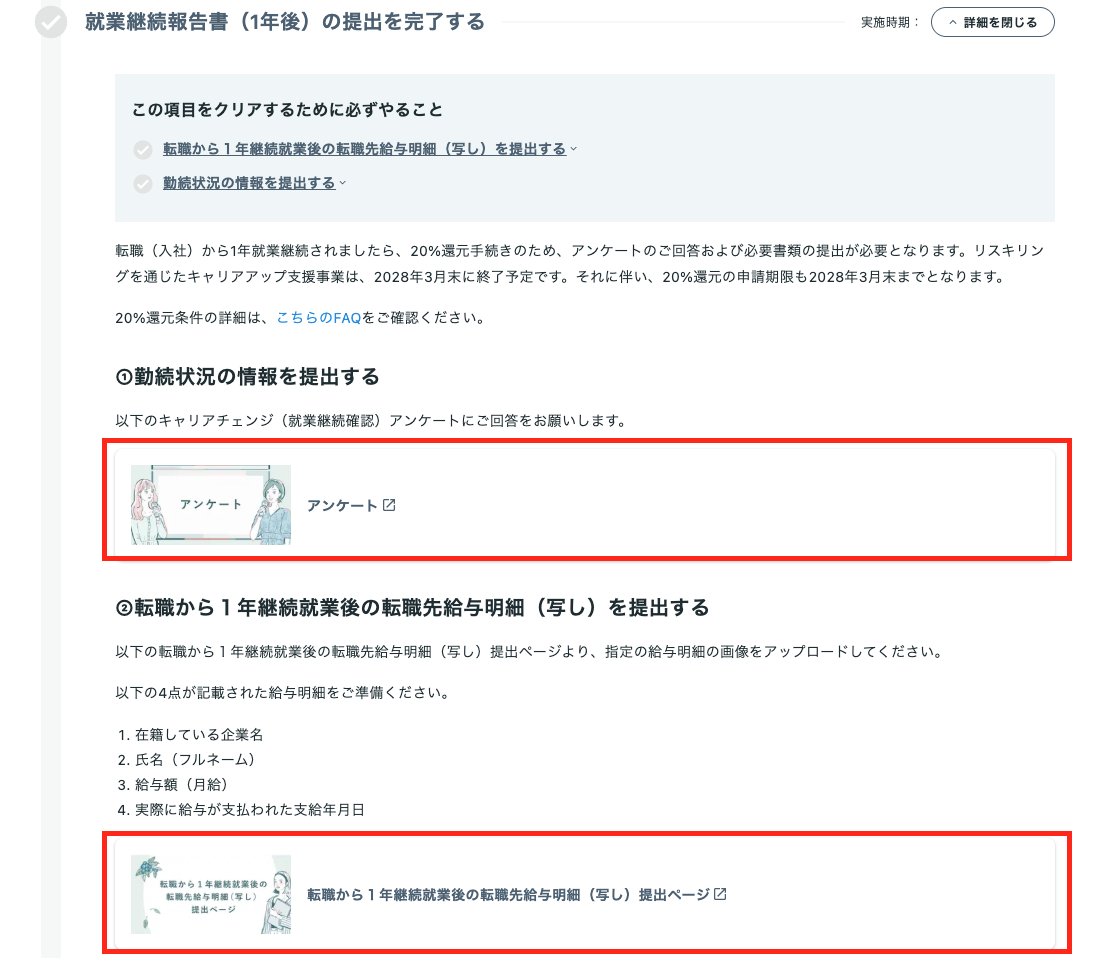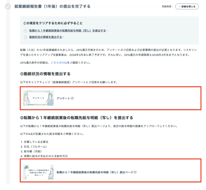 転職活動が終了(入社決定)後、マイページレギュラープランカリキュラムの【就業継続報告書(1年後)の提出を完了する】から以下2点の対応ください。