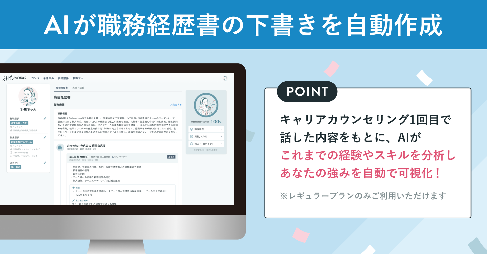 レギュラープランの方向けに、AIがこれまでの経験やスキル、強みを自動で可視化し、職務経歴書の作成をサポートする機能です