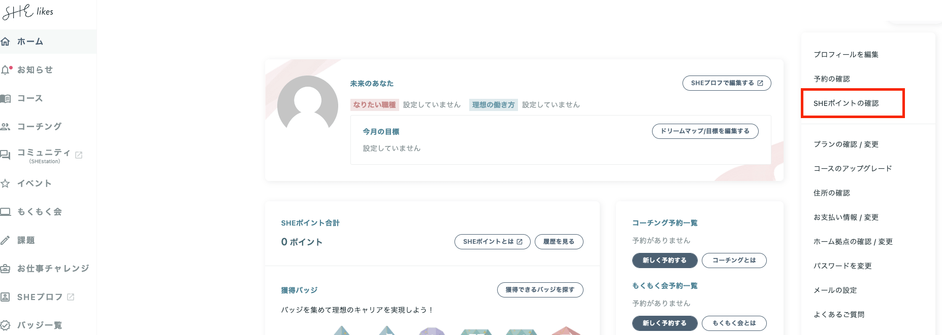 ポイントの獲得・利用履歴の確認方法①マイページログイン後、右上のアイコンを押して「SHEポイントの確認」ページにアクセスしてください。 ポイントの獲得・利用履歴がご覧いただけます。ポイントに有効期限はある?ポイント獲得後6ヶ月間が有効期限となります。 例:6月末に獲得したものは12月末が有効期限となります