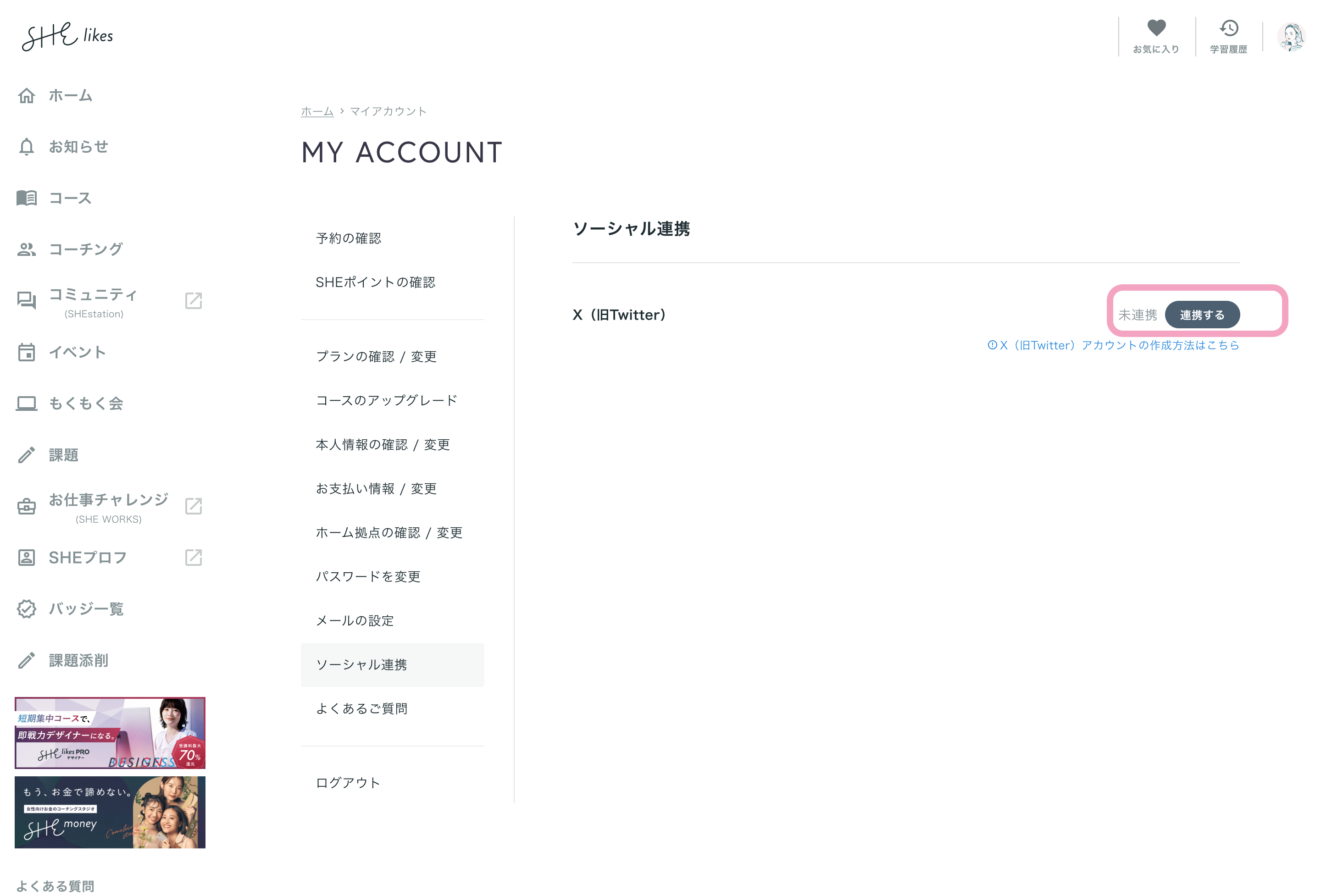 SHElikesマイページからご自身のX(旧Twitter)アカウントを連携できる機能です。