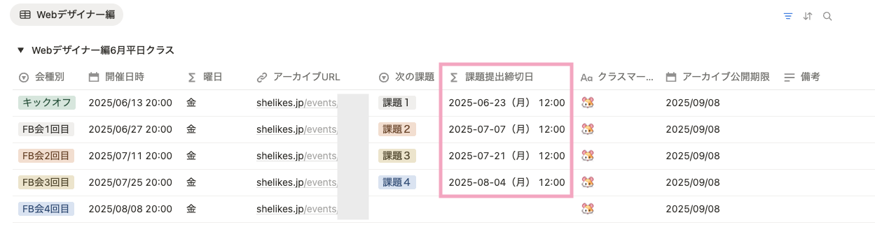 「課題・アーカイブ一覧ページ」の該当クラスの表にある「課題提出締切日」からご確認いただけます。
