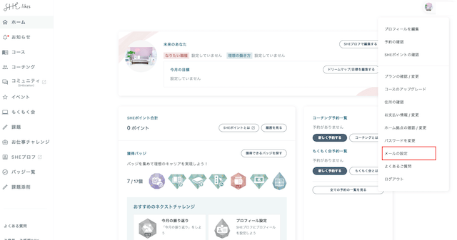 ①マイページログイン後、右上のアイコンを押して「メールの設定」ページにアクセスしてください