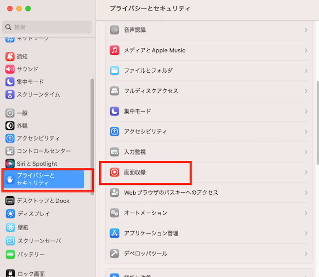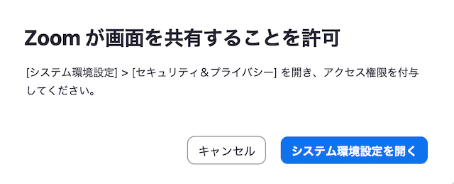 設定手順:システム環境設定>セキュリティとプライバシーの設定>プライバシー>画面収録 で、Zoomにチェック