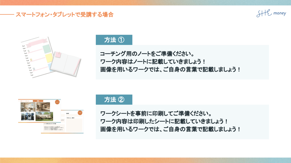 ①PC(Windows・Mac問わず)/タブレット/スマートフォンのいずれか ※コーチングはGoogleスライドを使用するためPCでの参加を推奨しておりますが、受講用にノートをご用意いただくか、配布物を事前に印刷していただき、ご参加いただくことも可能です。