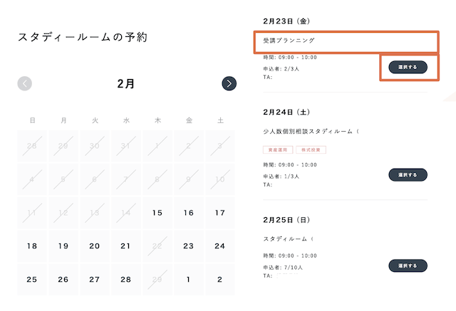 ③スタディルームの予約ページにある【受講プランニング】の中で参加可能な日程を選択する