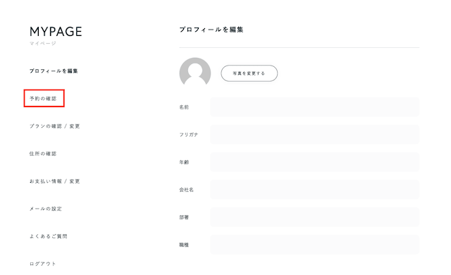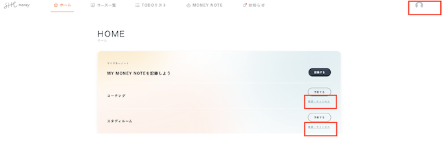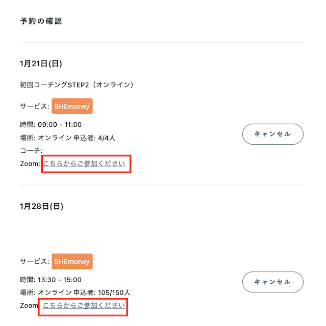 ①HOMEの予約一覧、もしくは右上のアイコンを押下し、遷移先の予約の確認ボタンを押す ※ご予約時にお送りしているメールからもZoomへご入室が可能です