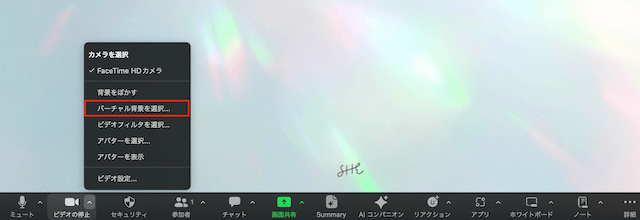 ①Zoomの下に出ているツールバーの「ビデオの停止」右横の🔼から「バーチャル背景を選択」をクリック