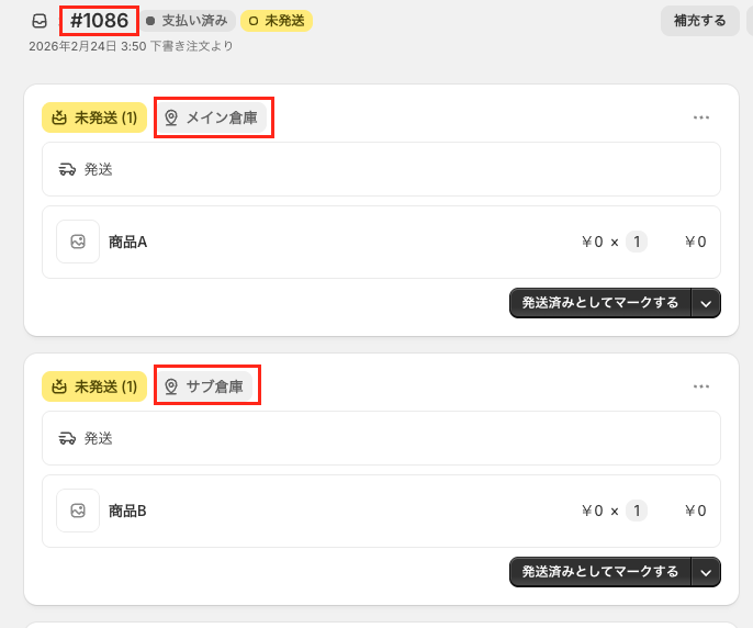 複数のロケーションにある商品を受注したとき、Shopifyでは一つの注文として管理されます。