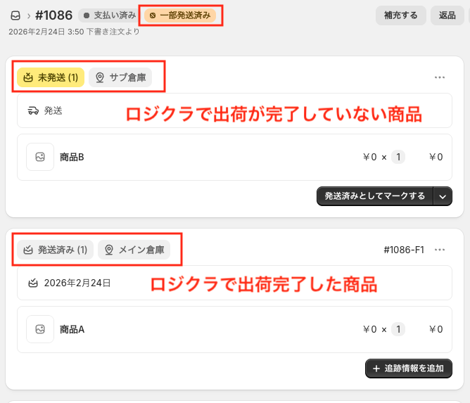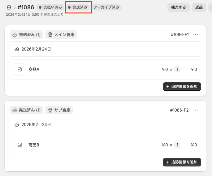 ロジクラで注文に含まれる全ての商品を出荷完了すると、Shopifyのフルフィルメント状況は「発送済み」に更新されます。
