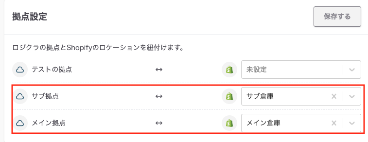 Shopify連携設定 > 拠点設定でロジクラの拠点とShopifyのロケーションが紐づいている