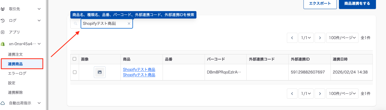 商品連携が正しく行われているかは、Shopify連携設定の「連携商品」から確認できます。