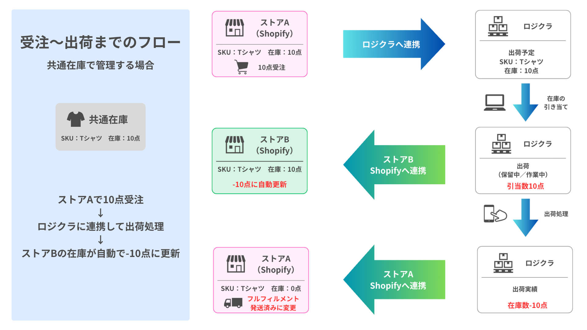 以下の図のように、ストアAで受注した商品をロジクラと連携して出荷することにより、ストアBの商品在庫を減らします。