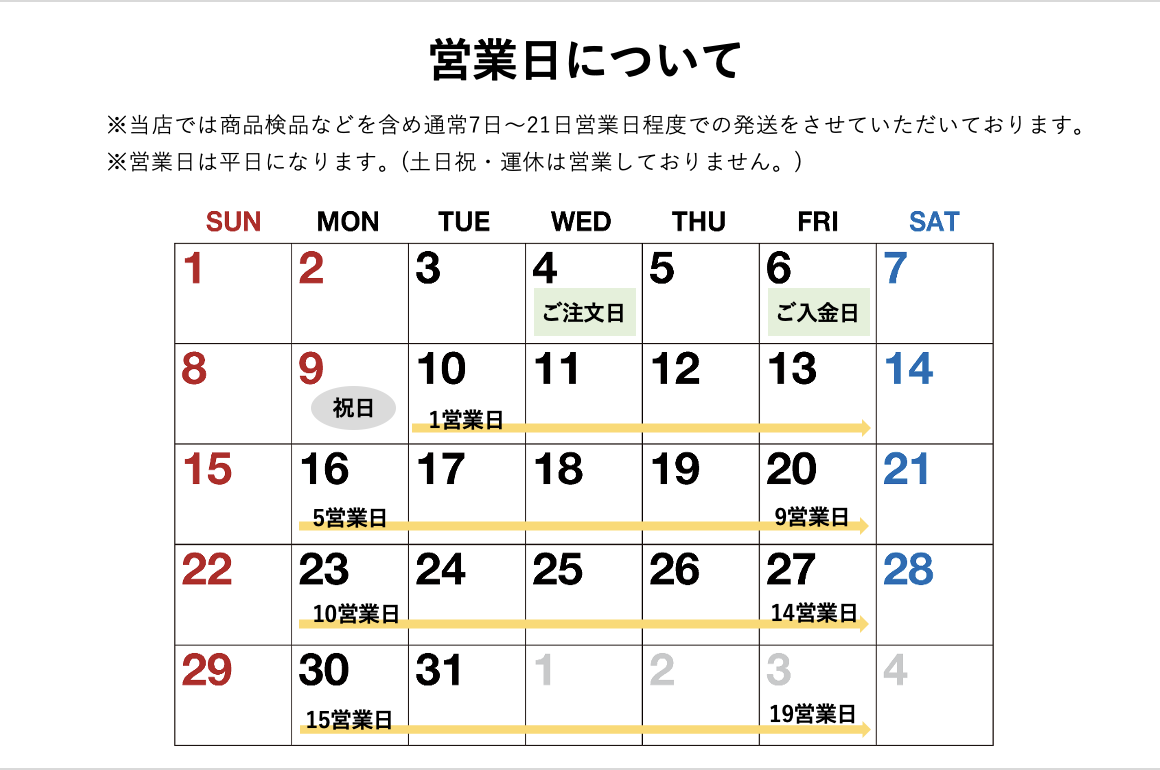 物流の状況により目安より遅れる場合がございますのでご了承ください。