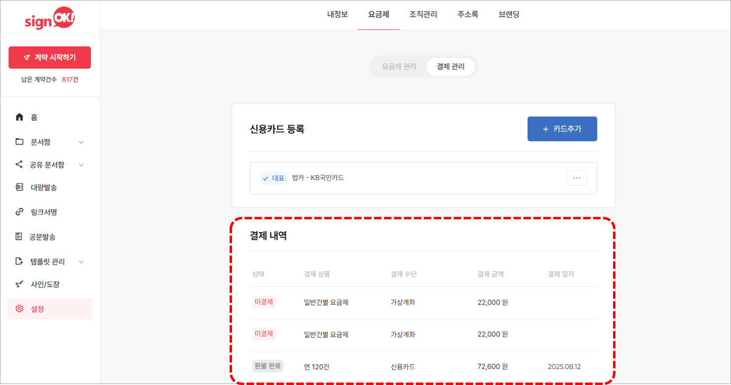 1. 싸인오케이에 로그인한 후, [설정]의 [요금제] 메뉴로 이동합니다.