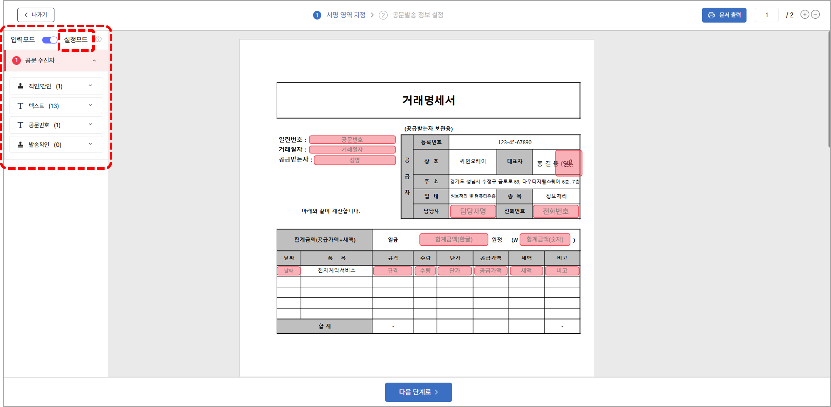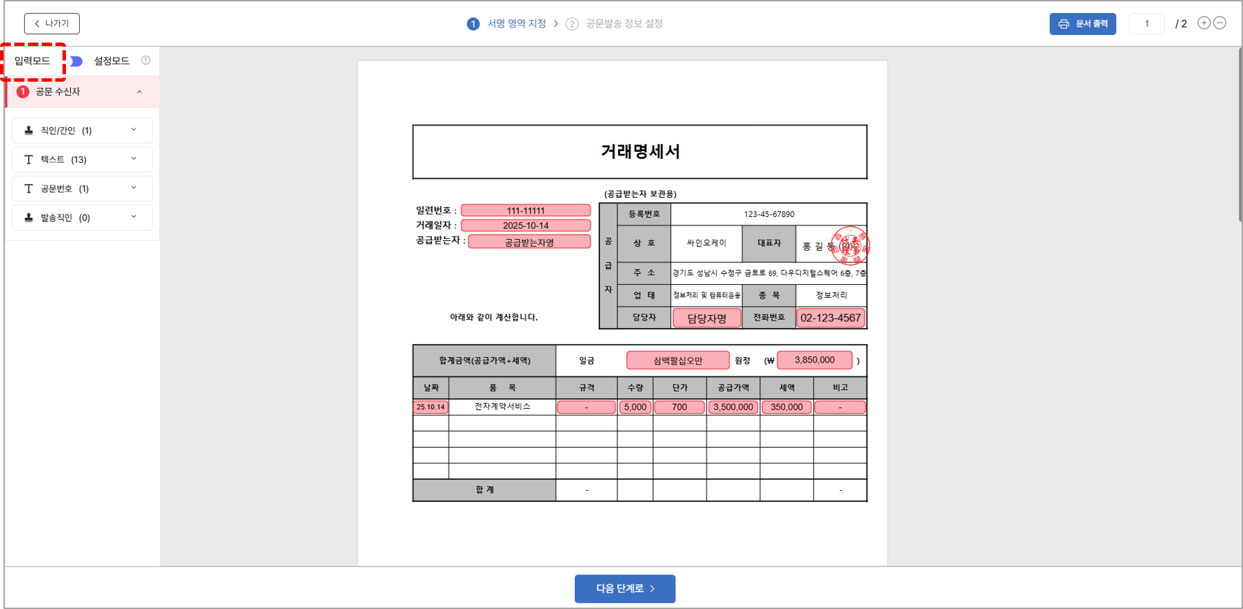 5. 좌측 상단의 스위치를 통해 [입력모드]로 변경한 뒤 설정한 박스에 내용 및 도장을 입력한 후 [다음] 버튼을 클릭합니다.