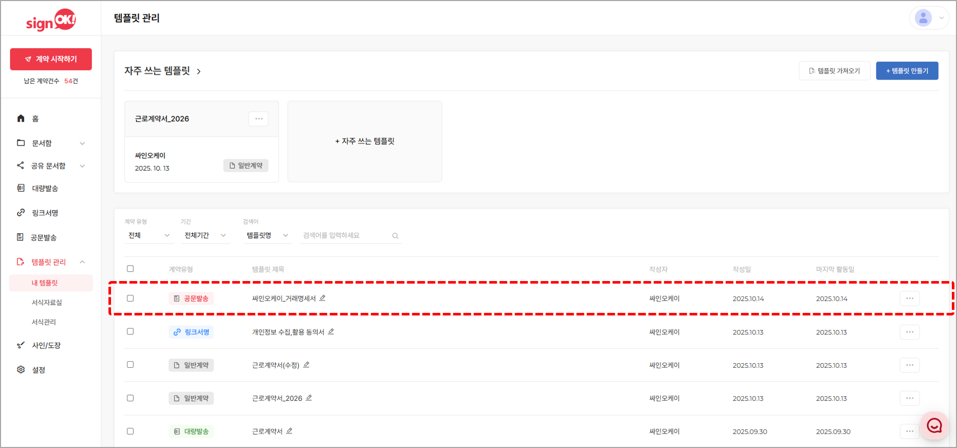 8. [템플릿 저장하기]를 클릭하면 공문발송이 가능한 템플릿이 생성됩니다.