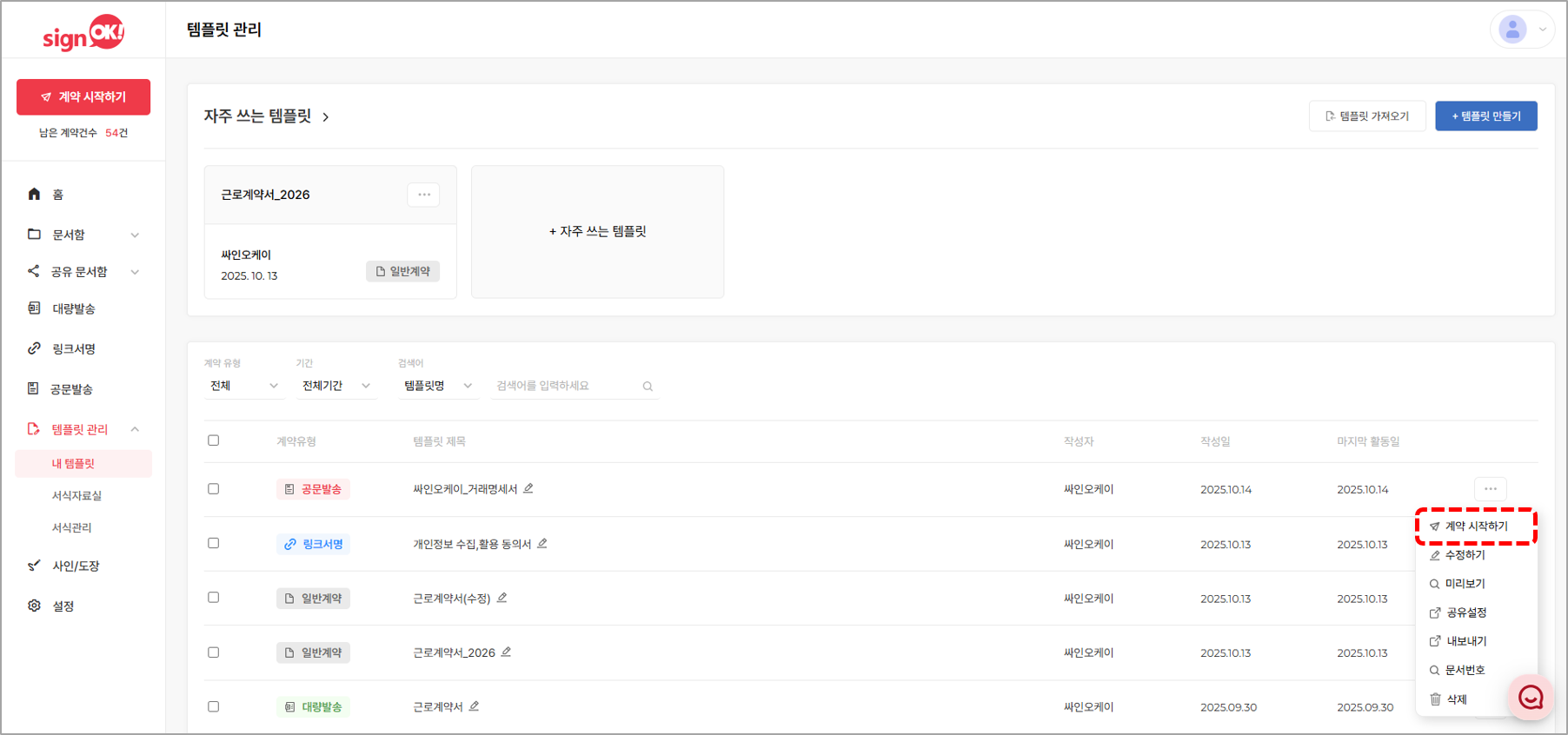 1. 싸인오케이 로그인 후, 좌측의 [템플릿 관리]의 [템플릿] 메뉴를 클릭합니다.